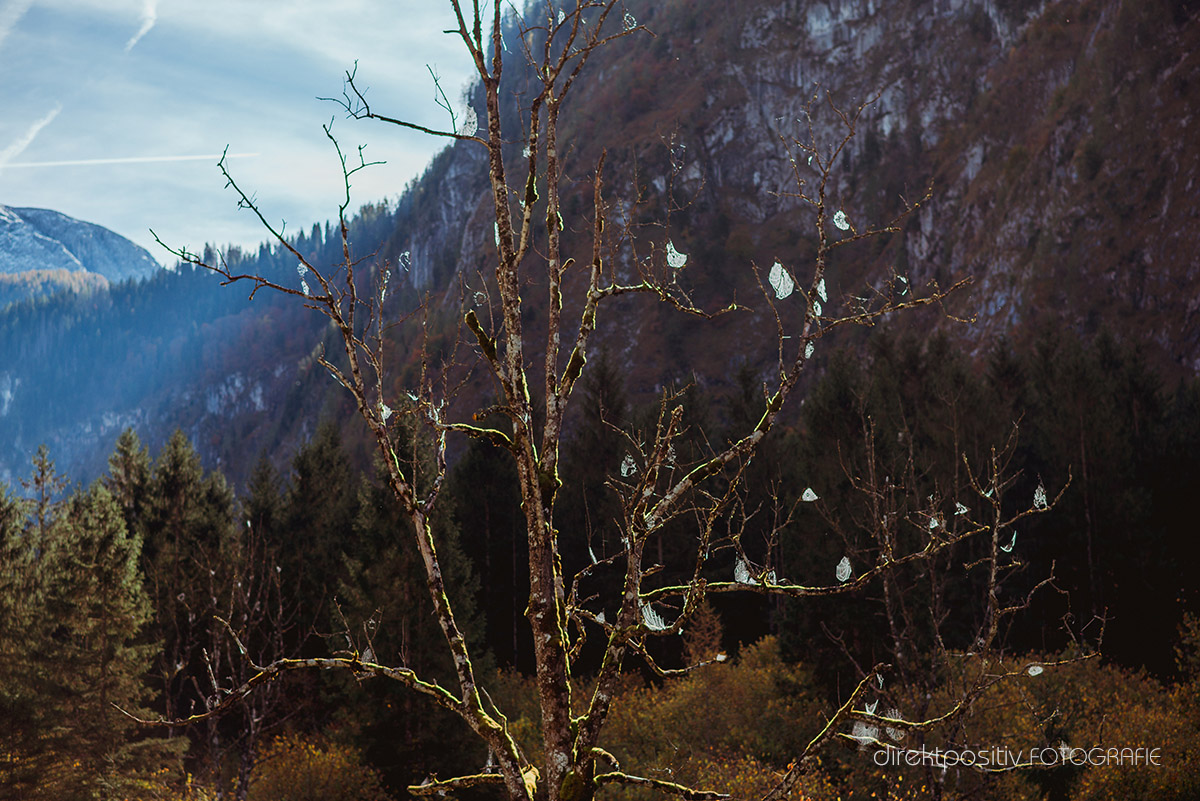 Mit Spinnweben geschmückter Baum. Sie leuchten in dem Sonnenlicht und erlischen bald nach nur ganz kurzer Zeit.